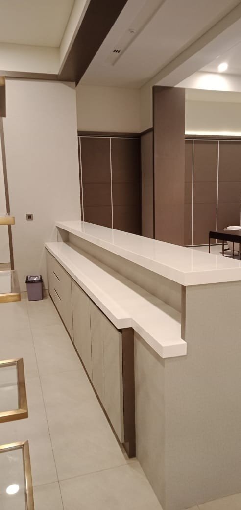 Meja granit, rak dinding, dan lemari set yang menyatu dengan dapur.